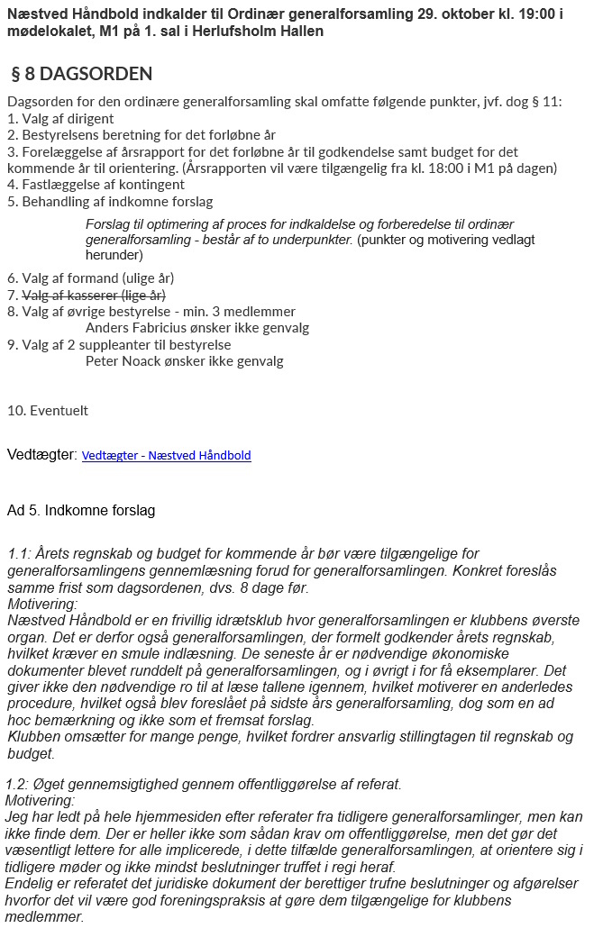 Næstved Håndbold indkalder til Ordinær generalforsamling 29. oktober kl. 19:00 i M1 i Herlufsholm hallen. Dagsorden følger jf. nedenstående, indsat fra vedtægter: Dagsordenen bekendtgøres på foreningens hjemmeside senest 8 dage fø...